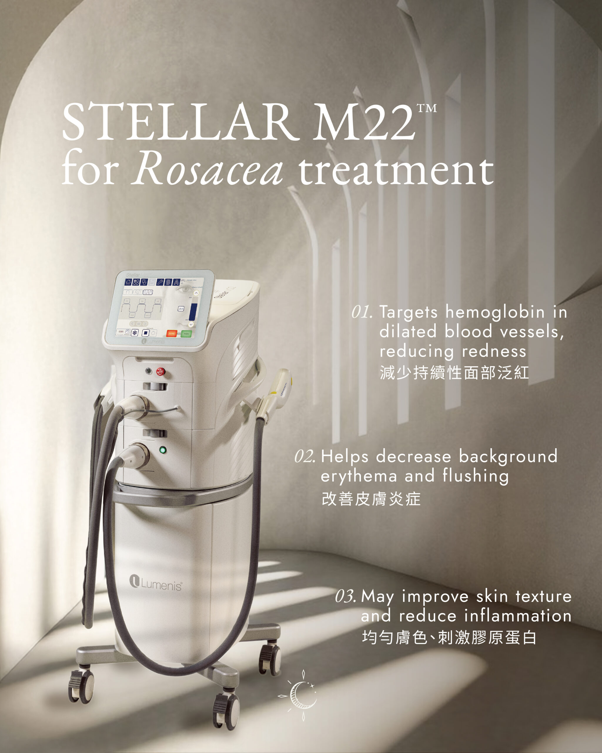 The Stellar M22™ (by Lumenis) is a Intense Pulsed Light (IPL) platform for treatment of rosacea, particularly for addressing erythema (redness), telangiectasias (visible blood vessels), and inflammatory papules/pustules.
